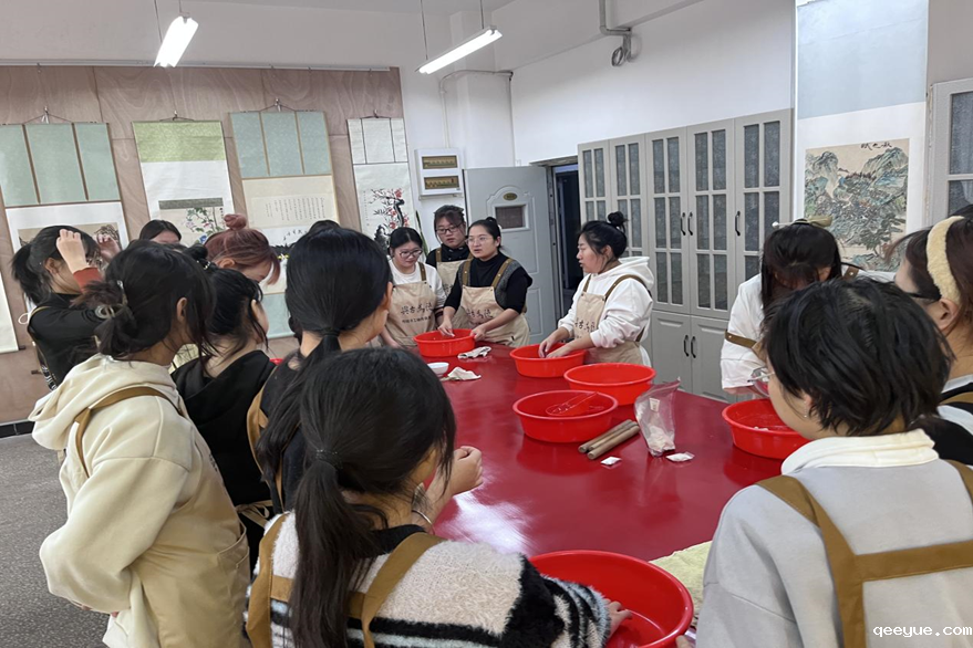 廉艺璇老师按照和面、洗粉、过筛、沉淀、制糊调糊的流程组织学员们传承传统制糊调糊技艺。