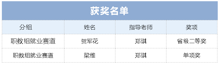 本届大赛以“筑梦青春志在四方,规划启航职引未来”为主题,共吸引了全省 85 所高校参加,约25 万名学生报名。经过层层选拔,最终我院郑琪老师指导的21级市场营销专业学生贺军花同学荣获职教组就业赛道山西省总决赛省级二等奖,21级大数据技术专业梁维同学荣获山西省大学生职业规划大赛单项奖。