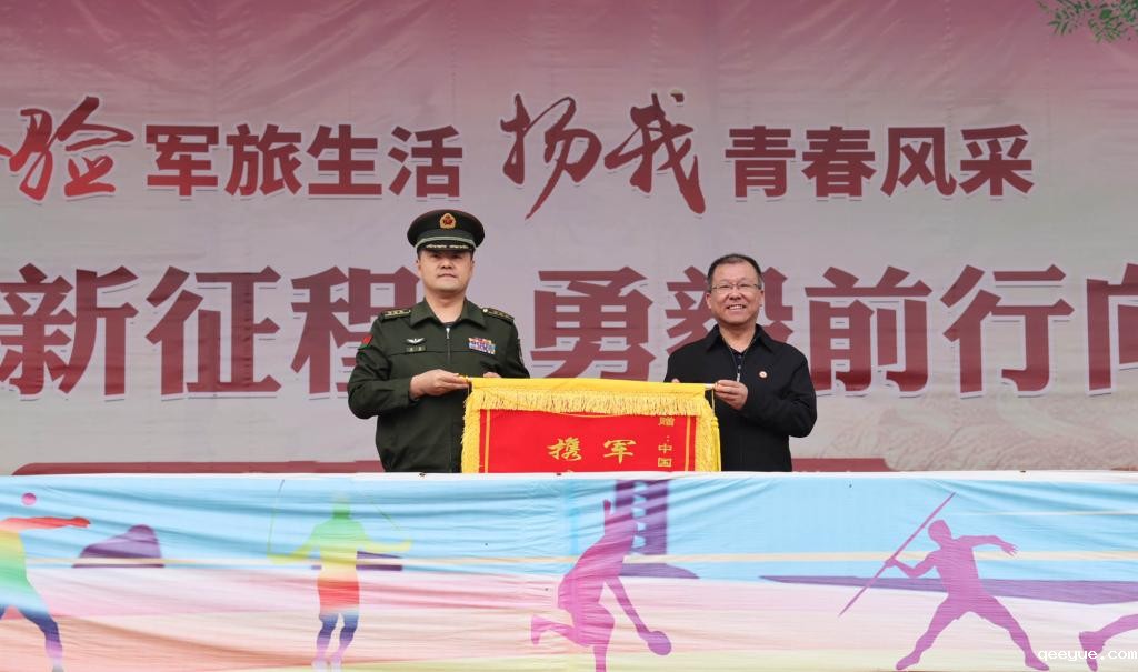 院党委书记韦阳向承训部队赠送锦旗。