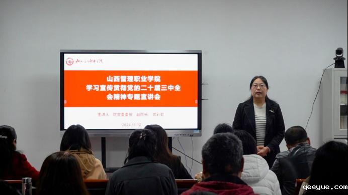 为深入学习宣传贯彻党的二十届三中全会精神,根据《中共taptap游戏app委员会关于学习宣传贯彻党的二十届三中全会精神的通知》部署,11月12日下午院党委委员、副院长尤彩虹在崇德楼1206为管理与服务系党支部和分管部门作党的二十届三中全会精神专题宣讲会。