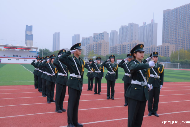 伴着激昂的凯歌,国旗护卫队昂首挺胸,迈着整齐有力的步伐,护送着鲜艳的五星红旗一路向前。伴随着雄壮的国歌,五星红旗在全体师生的注目礼中冉冉升起,飘扬在田径场上方。
