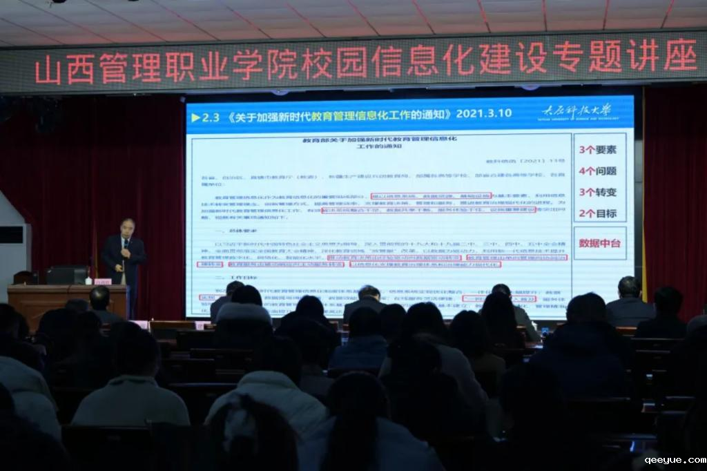 3月4日,学院在崇德楼三层报告厅举办校园信息化建设专题讲座。太原科技大学教育信息技术中心主任白尚旺教授应邀主讲,学院全体教师聆听了讲座。讲座由院党委委员、副院长尤彩虹主持。