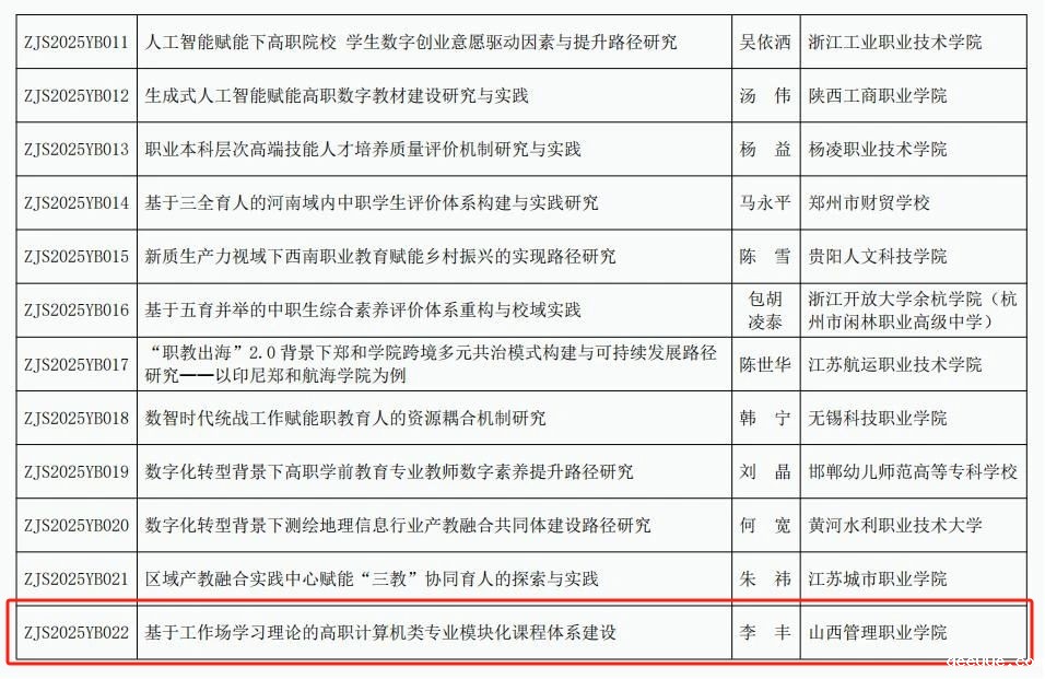 近日,中华职业教育社公示了2025年度规划课题拟立项名单。我院李丰老师团队申报的课题《基于工作场学习理论的高职计算机类专业模块化课程体系建设》成功入选一般规划课题类别。这是我院首次在中华职业教育社年度规划课题中成功立项,标志着学院在国家级职业教育理论研究与政策应用研究领域取得了重要突破。