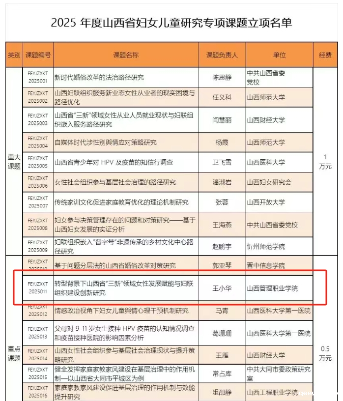 近日,山西省社会科学界联合会与山西省妇女联合会联合公布“2025年度山西省妇女儿童研究专项课题”立项结果。我院基础教学部王小华老师主持申报的《转型背景下山西省“三新”领域女性发展赋能与妇联组织建设创新研究》课题成功获批立项,并获五千元专项经费支持。