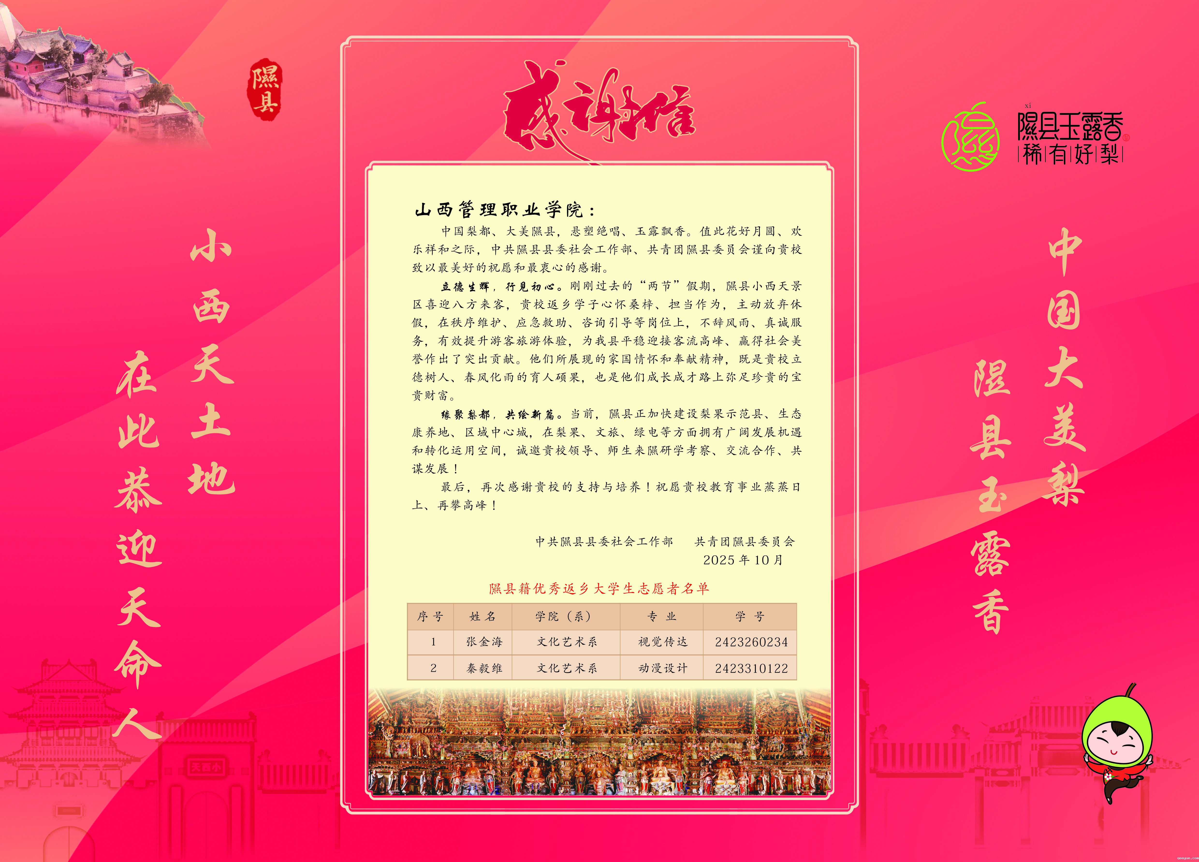 今年以来,学院接连收到来自中共隰县县委、隰县人民政府,共青团隰县委员会的两封感谢信,分别对同学们于今年寒假与暑假在隰县小西天景区提供的志愿服务予以高度赞扬。短短半年间,两度获誉,这不仅反映出学生们持续奉献、服务基层的良好风貌,也印证了我院以“厚德重能,笃行致远”校训为引领,将立德树人根本任务贯穿社会实践全过程,充分体现了实践育人工作的扎实成效。