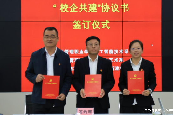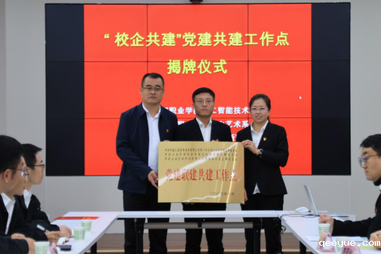 在全体参会人员见证下,三方代表共同签署《党建联建共建协议书》;随后,学院两系党支部书记联合为“校企党建联建共建工作点”授牌,标志着双方党建合作落地。