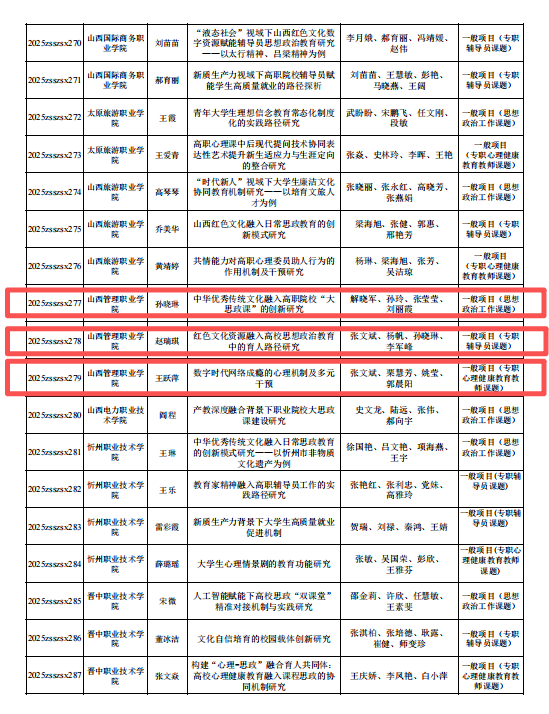 其中,王跃萍老师主持的《数字时代网络成瘾的心理机制及多元干预》获批专职心理健康教育教师课题;孙晓琳老师主持的《中华优秀传统文化融入高职院校“大思政课”的创新研究》获批思想政治工作课题;赵瑞琪老师主持的《红色文化资源融入高校思想政治教育中的育人路径研究》获批专职辅导员课题。