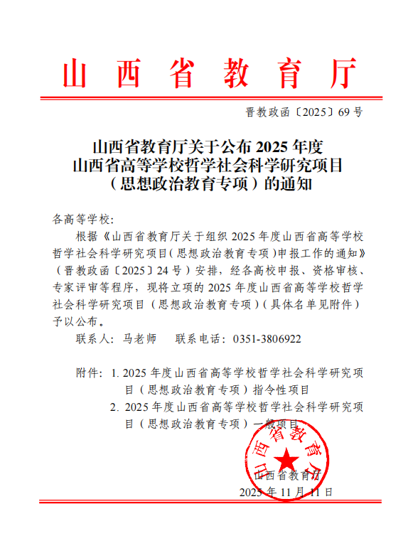 近日,山西省教育厅公布2025年度高等学校哲学社会科学研究项目(思想政治教育专项)立项名单,我院三项课题成功获批,立项数量与质量均实现新突破。